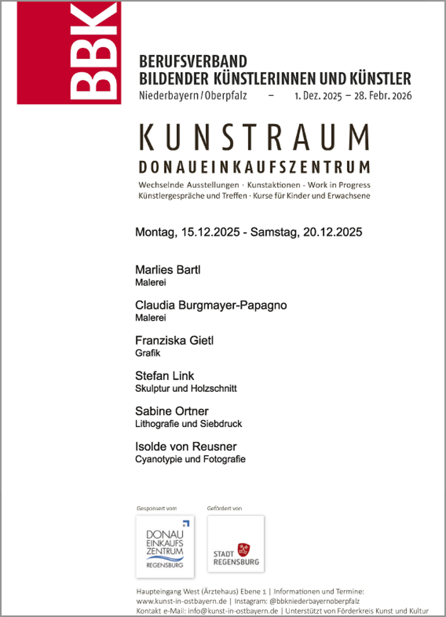 Der Berufsverband Bildender Künstlerinnen und Künstler (BBK) Niederbayern/Oberpfalzverwandelt ab dem 1. Dezember 2025 eine leerstehende Verkaufsfläche im Donau-Einkaufszentrum (DEZ) in eine lebendige Plattform für zeitgenössische Kunst. |