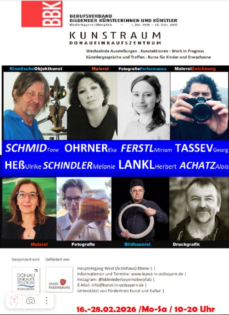 Den Auftakt machen vom 1. bis 6. Dezember 2025 die Künstler:innen Maria Maier (Zeichnung,Grafik, Malerei, Fotografie), Ulrich Koch (Bilder, Zeichnungen, Gouachen, Objekte) und RenateHaimerl-Brosch (Objekte, Bilder, InstallaKonen). Insgesamt beteiligen sich über 40 Kunstschaffendean dem Projekt und freuen sich auf den Dialog mit dem Publikum.